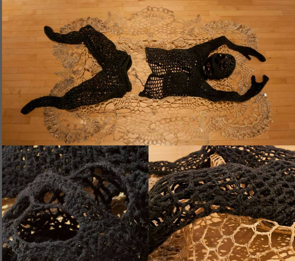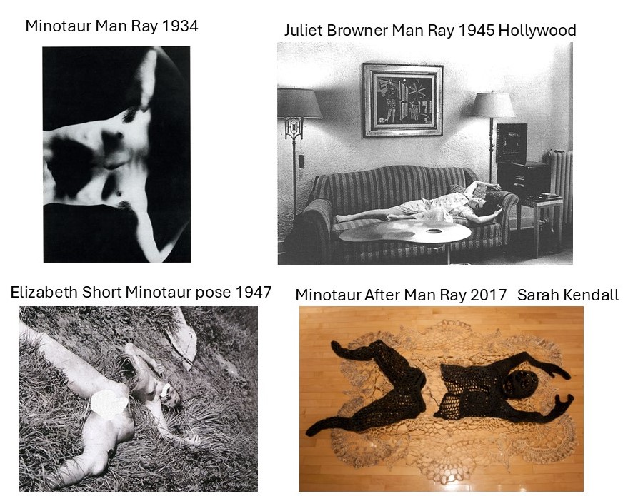 Nice interview with Artist Sara Kendall. Her crocheted art sculpture, titled: “Minotaur After Man Ray.” is such an interesting interpretation of Man Ray’s photos and by inference the posing of Elizabeth Short’s body after her murder by GHH in the ‘minotaur pose’. From the photos I originally saw of SaraBeth’s art piece one could tell that the sculpture was three-dimensional, but it had no physical size dimension. So to hear SaraBeth say that she crocheted the life-size’ figure on her own body, starting at the toes, certainly added to the viewer’s perception of her work (in photographic media). It is a bold expression of her intent to show or display the image of the severed body of Elizabeth Short (The Black Dahlia) in a non-sensationalist manner. I think she accomplished her intent. All the while leading back to, or echoing, it’s inspiration. rjs